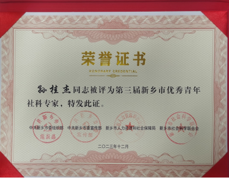3月13日上午,新乡全市社科工作会议在市社科联会议室隆重召开。本次会议旨在表彰2023年度在社会科学工作中做出杰出贡献的单位和个人,同时为第三届优秀青年社科专家颁发荣誉证书,总结去年全市社科工作的成果,并对2024年的工作进行安排部署。我校周斌、孙桂杰、康军帅三位博士凭借在社会科学领域所取得的成绩,荣获第三届新乡市优秀青年社科专家称号,受到表彰和嘉奖。